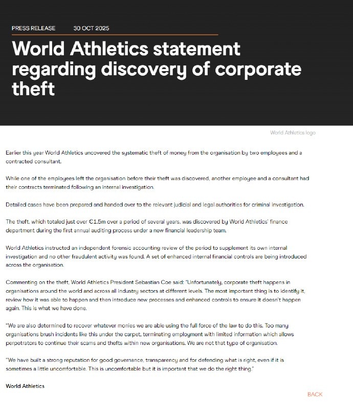 从初步的审计中,世界田联的新财务团队便发现了这起令人震惊的盗窃案。正是在这一过程中,刺痛的真相浮出水面:一名盗贼在事务被揭穿前已选择离去,另两位则因内部调查的结果而被火速解雇。眼下,相关案件的所有资料已上交给相关的司法和法律机构,正等待着严肃的刑事调查。