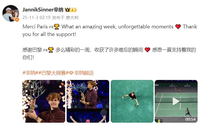 在比赛结束的那一刻,辛纳的脸上洋溢着胜利的微笑,他将这份荣耀与向往分享给了全世界。在他的社交媒体上,那张捧杯的照片宛如星光璀璨,而他则以简洁而真诚的言辞向巴黎致以了谢意。“Merci Paris ???”,这不仅是对城市的感激,更是对这份支持与热爱的独特礼赞。