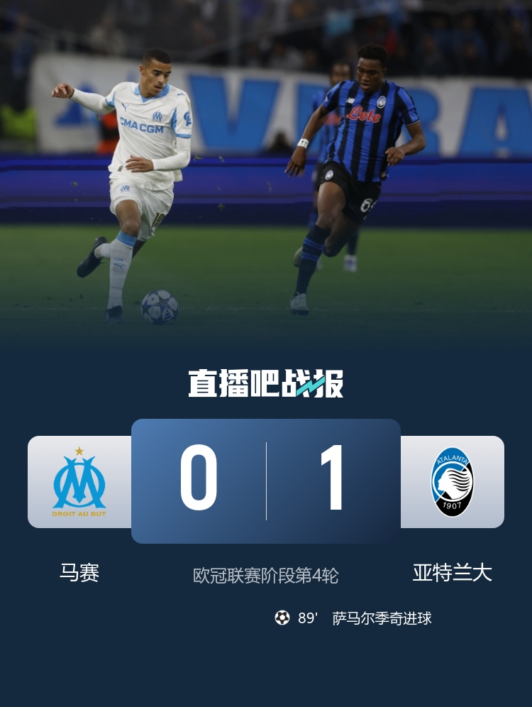 在11月6日凌晨4点,欧冠联赛的第四轮比赛中,马赛在韦洛德罗姆球场对阵亚特兰大。此役,亚特兰大经过90分钟的激战,以1-0小胜马赛,结束了球队各项赛事连续六场不胜的尴尬局面。