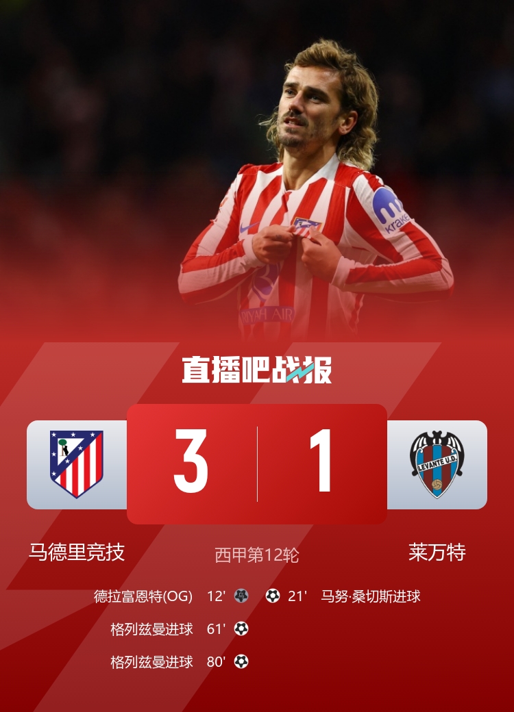 比赛进行到第80分钟,马竞的进攻已经越发高效。格列兹曼再次展现了他的得分能力,在一次前场断球后,他跟进补射,再次将比分扩大到3-1。莱万特无力回天,最终马德里竞技以3-1战胜了莱万特。