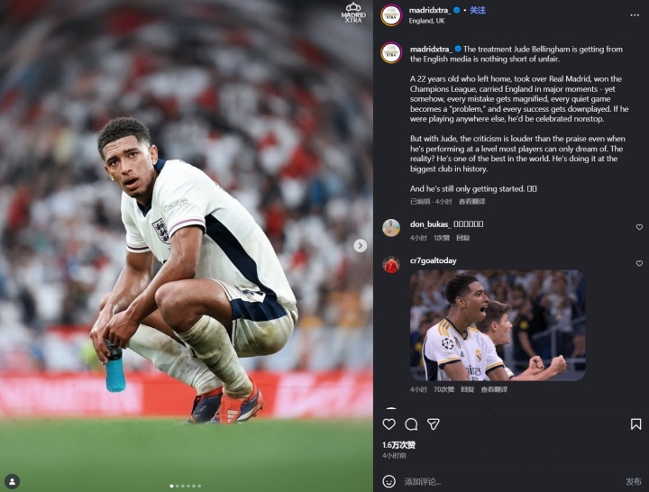 在这场焦点战役中,英格兰以2-0战胜阿尔巴尼亚,年轻球员贝林厄姆在第84分钟被替换下场,随即引发了媒体的诸多讨论。针对这一事件,MadridXtra的社交媒体发言引起了足够关注,尤其是对贝林厄姆表现与评价的不满。