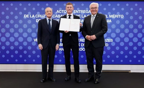 在伯纳乌的荣誉包厢内,克罗斯接受了德国总统施泰因迈尔亲自授予的荣誉,出席仪式的还有皇马名誉主席何塞·马丁内斯·皮里、机构关系总监布特拉格诺、主帅阿隆索及多位球员和传奇球员。