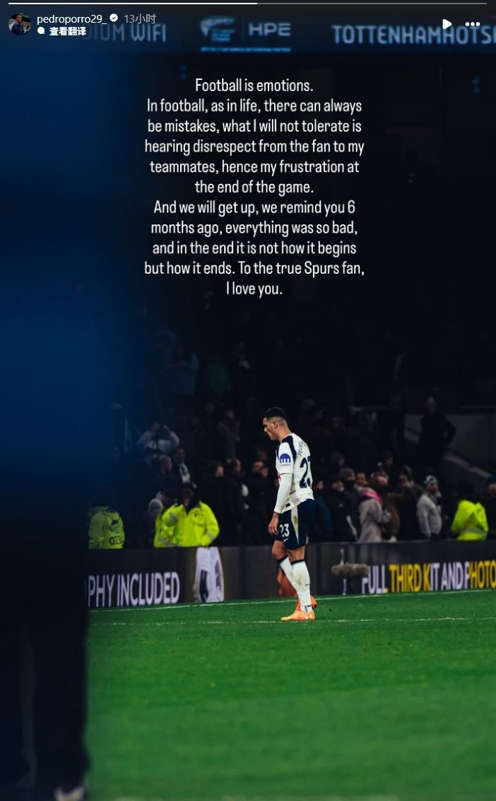 12月1日讯 热刺的边后卫佩德罗·波罗在社交媒体上发表了一番言论,回应了近期球迷对他的批评声。在热刺与富勒姆的比赛中,波罗在赛后被拍到对年轻队友贝里瓦尔表现出愤怒,并且显得漠视球迷的呼喊,直接走回了更衣室,因此遭到了不少人的指责。
