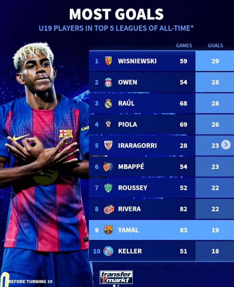 而且,喜欢统计数据的朋友们可能会发现,亚马尔不仅仅是个天赋异禀的小将,他的名字还赫然出现在五大联赛历史U19射手榜的前十名中。想想吧,这青年小伙儿才在巴萨打了不久的球,竟然能够和一众巨星们同台竞技,果然是应了那句“人外有人,天外有天”的老话,才能以19球的成绩跻身榜单。这就像是在告诉我们,这个名额可不是什么人都能拿到的。