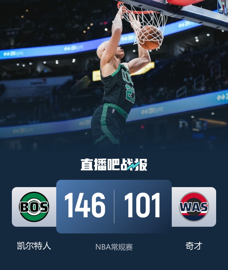 下半场开始后,凯尔特人继续控制节奏,怀特与沃尔什联手带领球队进一步扩大领先优势。在比赛的末节,奇才的进攻出现了崩盘,凯尔特人则乘胜追击,安芬尼·西蒙的四记三分球让球队以21-5的疯狂得分潮将差距扩大到39分。胜局已定,奇才显得无力回天。最终,凯尔特人以146-101的巨大优势结束了比赛,轻松在客场取得胜利。
