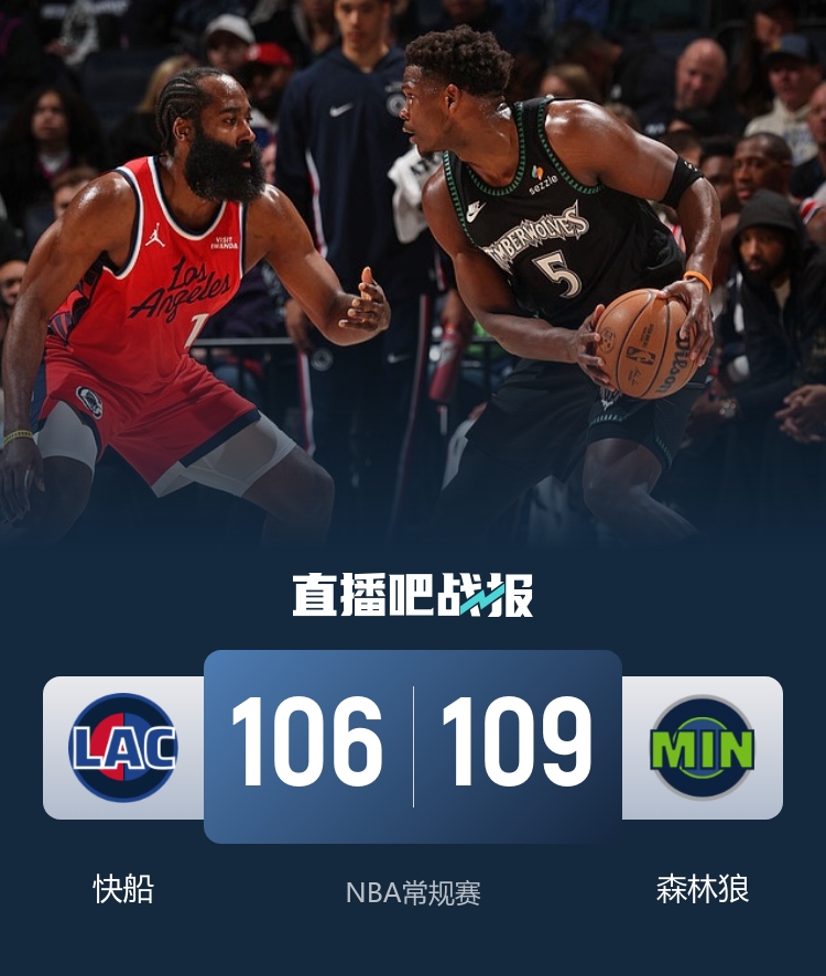 快船(6胜18负):哈登34分5篮板6助攻4抢断,莱昂纳德20分3篮板2助攻,祖巴茨15分13篮板2助攻,科林斯12分2篮板,博格达诺维奇9分1篮板2助攻,邓恩8分6篮板4助攻3抢断,巴图姆3分4篮板,洛佩斯3分,桑德斯2分1篮板。
