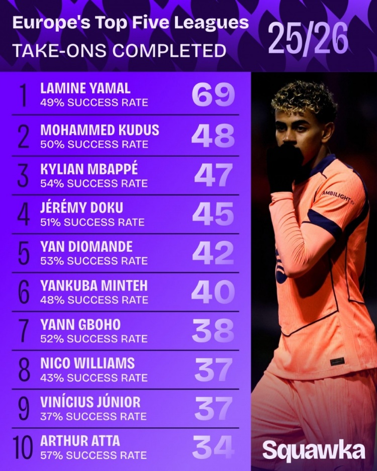 而毕尔巴鄂竞技的尼科·威廉姆斯则以34次过人闯入榜单,尽管成功率在37%,却仍找到了自己的节奏,成为球队值得信赖的攻击利器。乌迪内斯的亚瑟·阿塔同样表现不俗,以34次过人位列其中,成功率达到57%。