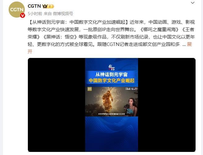 12月22日讯 今日,中央广播电视总台CGTN的官方微博发布了一段精彩的视频,生动展示了中国数字文化产业的迅速崛起。视频中指出,《哪吒之魔童闹海》《王者荣耀》以及《黑神话:悟空》等一系列具有影响力的作品,不仅刷新了市场的多项纪录,还让世界以更年轻与数字化的视角感受到中国文化的魅力。