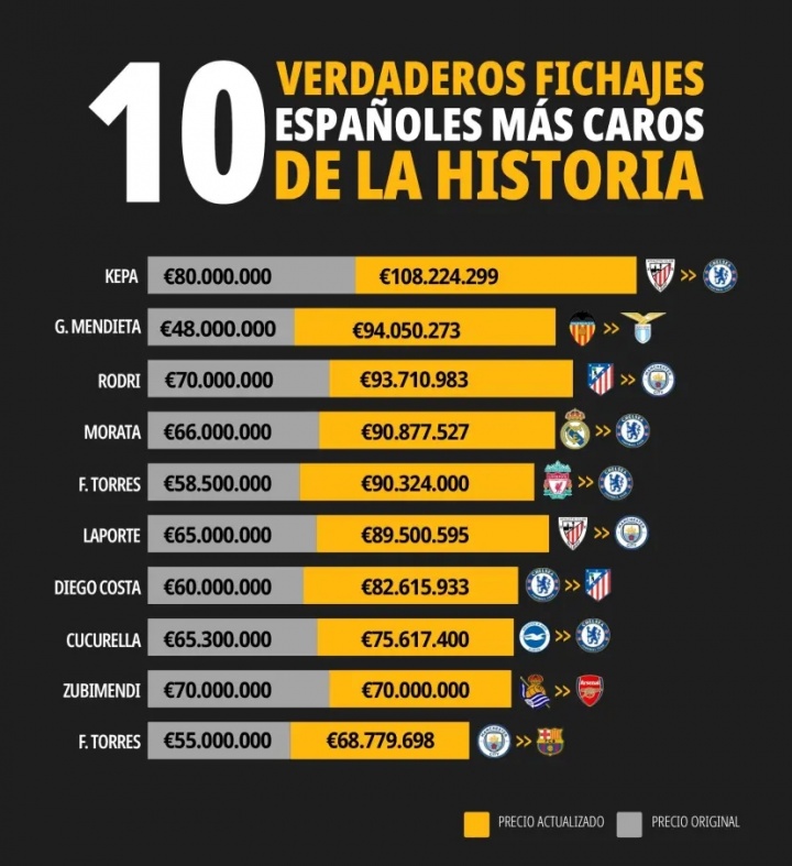 西班牙媒体《马卡报》近日发布了一份关于西班牙球员转会费前十名的榜单,特别考虑到了通货膨胀的因素。文章中提到,凯帕在2018年以8000万欧元的转会费从毕尔巴鄂竞技转会至切尔西,经过通货膨胀的调整,这笔转会的现值已达1.08亿欧元。