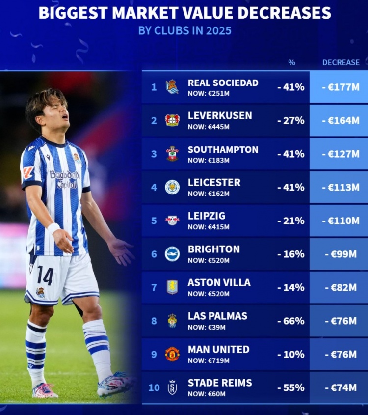 首先,位于榜首的是皇家社会,这支西班牙球队的身价高达2.51亿欧元,然而,他们却经历了震撼的贬值幅度,跌幅达到了41%,净损失约为1.77亿欧元。这样的现实无疑让他们的支持者倍感失落,曾经的辉煌似乎在时间的流逝中黯然失色。