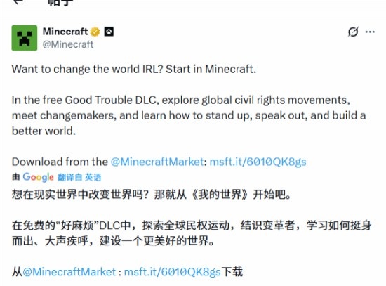 2月4日,《我的世界》官方通过X平台发布公告,推出了名为“Good Trouble”的免费DLC,以纪念黑人历史月。该内容旨在让玩家通过游戏了解全球民权运动及其重要历史人物。然而,这一消息立即引发了广泛争议,许多玩家和家长对其表示反对,指责这一DLC为“政治宣传”。为应对激烈的反响,Mojang公司迅速做出反应,限制了公告的留言功能,从而引发了舆论的进一步发酵。