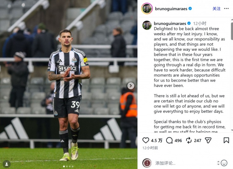 他特别感谢了俱乐部的医疗团队,称赞他们以创纪录的速度帮助他恢复健康,同时也对自己的团队表示了感激,感谢他们的支持让他得以尽快重返赛场。吉马良斯的乐观态度和坚定信念无疑为球队注入了积极的能量,期待纽卡斯尔能够在未来的比赛中反弹,重现辉煌!加油,纽卡斯尔!