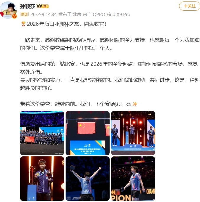 2月9日,海口乒乓球亚洲杯女单决赛中,孙颖莎以4-3的精彩表现战胜了王曼昱,勇夺冠军。在随后的社交媒体上,孙颖莎分享了她的感想: