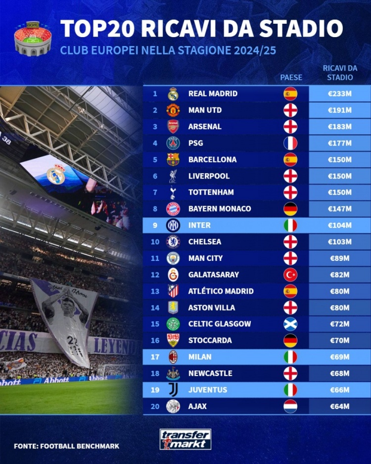 至于巴萨和利物浦,均以1.50亿欧元收尾,真是令人唏嘘,原本都是足球的豪门,如今却在票房之争中显得踟蹰不前。热刺同样以相同的收入排在这一档次,看来虽然他们的球场新颜令人眼前一亮,但在收益上却并不能帮助他们克服“英超偏见”。