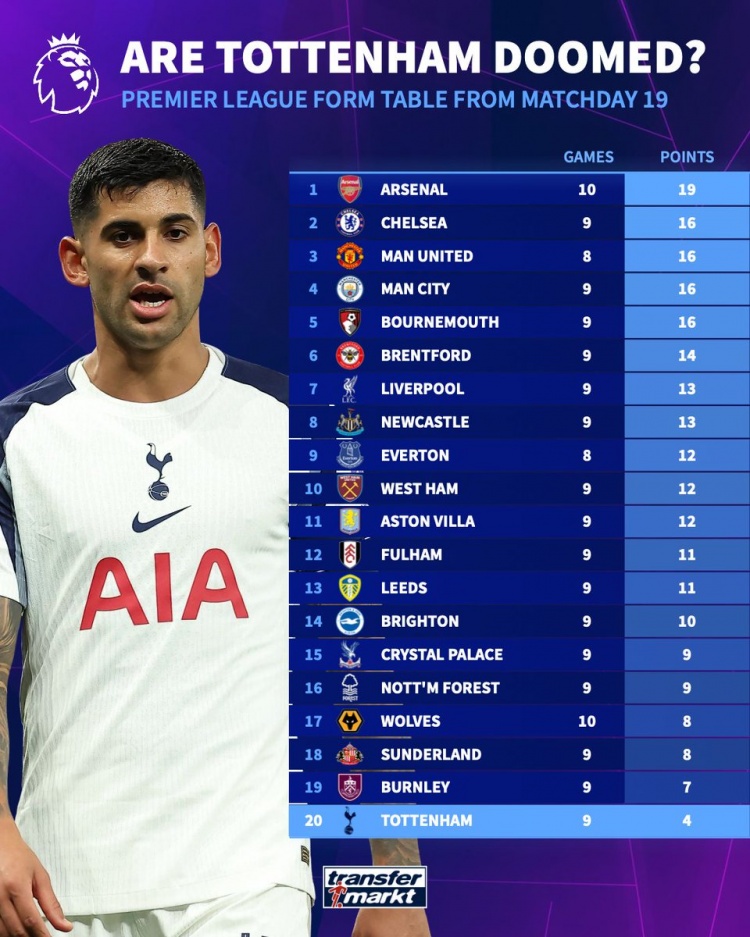 根据德国转会市场的统计,自英超第19轮以来,各支球队的积分情况揭示了不同球队在赛季后半段的表现。阿森纳的表现尤为突出,在过去的10场比赛中,他们取得了19分,毫无疑问是本轮积分榜的领头羊。