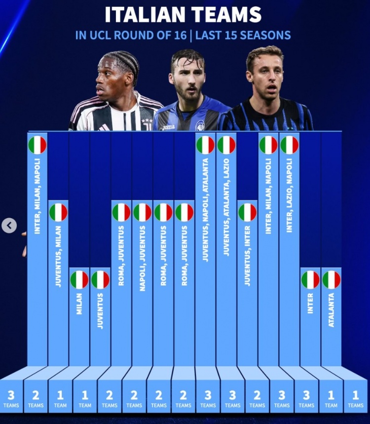 根据《转会市场》的数据,这些年意大利足球在欧冠赛场上表现得风起云涌,各支球队的晋级情况也颇有看点。展望未来,2026年只有亚特兰大一支球队跻身欧冠16强。而在过去的数年中,国米、那不勒斯和尤文则纷纷在不同时间段展示了他们的实力。