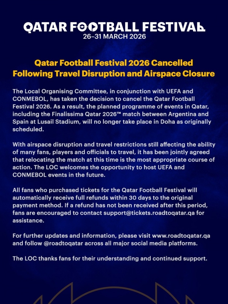 在如此艰难的时刻,组织委员会对未来的机会依然抱有希望,期待再次承办欧足联和南美足联的各类赛事。面对这场突如其来的变故,所有那些满怀期待前往卡塔尔的球迷同样不应失望。对他们而言,已购入的卡塔尔足球节门票将在未来30天内通过原支付渠道全额退款,虽非心中渴望的那场精彩对决,却也让他们在经济上得以缓解一些遗憾。
