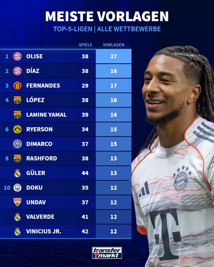 德国转会市场无情地列出了五大联赛本赛季的助攻数据,而奥利塞在这项统计中不仅是领先者,简直是一道光芒四射的存在,27次助攻让他在球场上俨然成了首席助攻大师。拜仁众星云集,但看来奥利塞的表现几乎让其他队友黯然失色。