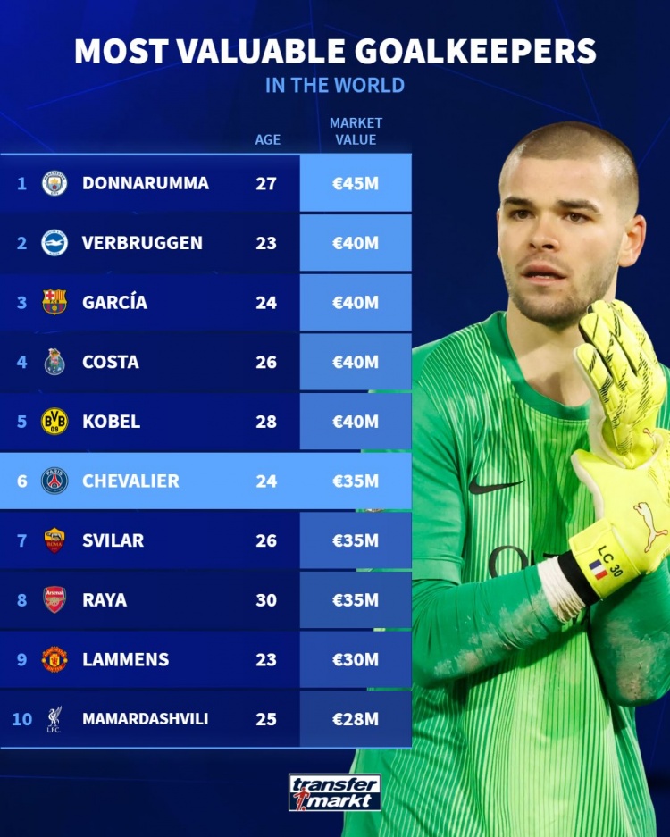 此外,舍瓦利耶(巴黎)以3500万欧元的身价排名第五,同样值得关注的还有斯拉维尔(罗马)、拉亚(阿森纳)、以及拉门斯(曼联),他们的身价均为3500万欧元。而马马尔达什维利(利物浦)则以2800万欧元的身价占据了榜单的最后一位置。
