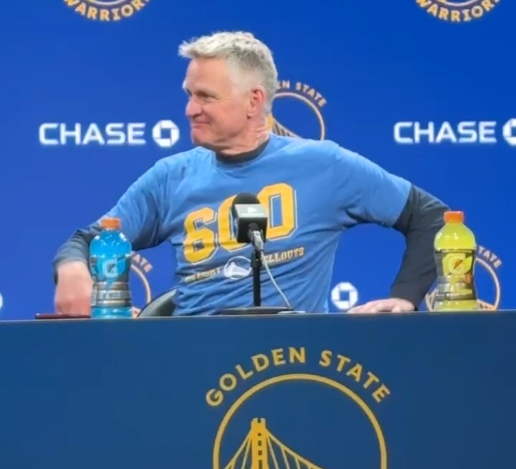 勇士队回到主场迎战篮网,主教练科尔在赛前穿着纪念其600胜的T恤接受了媒体采访,他提到了一些球队目前的状况。