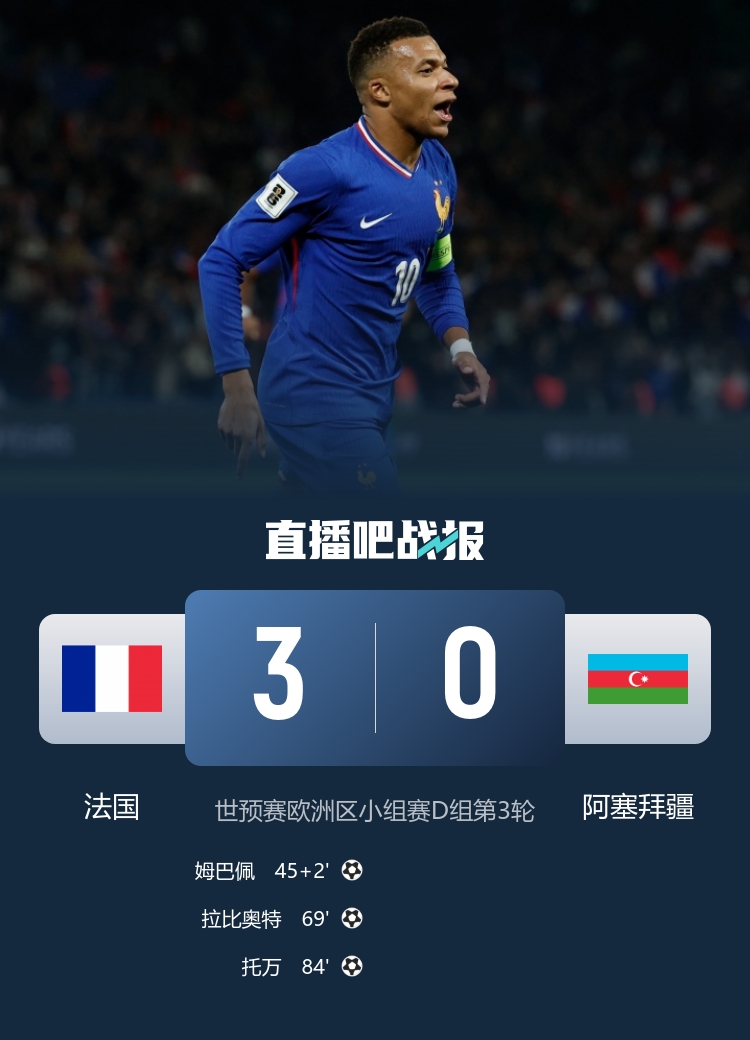 10月11日,在欧洲区世预赛D组的第三轮较量中,法国国家队在王子公园球场迎战阿塞拜疆。这场比赛上半场,法国的超级明星姆巴佩表现出色,打破了场上的僵局。到了下半场,埃基蒂克的射门击中门柱,随后拉比奥特扩大了领先优势。尽管姆巴佩在比赛中不幸受伤缺阵,但托万替补登场后为球队锁定了胜局。最终,法国队以3-0的比分轻松战胜了阿塞拜疆。