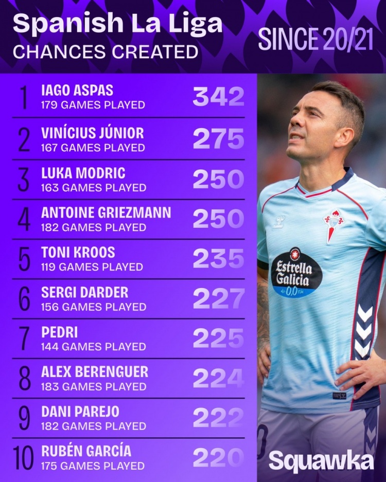 在西甲自2020-2021赛季以来,根据Squawka的统计,创造进攻机会方面表现突出的球员中,阿斯帕斯以342次的成果高居榜首。他在179场比赛中展现了出色的创造力,使得他的球队在进攻端受益匪浅。