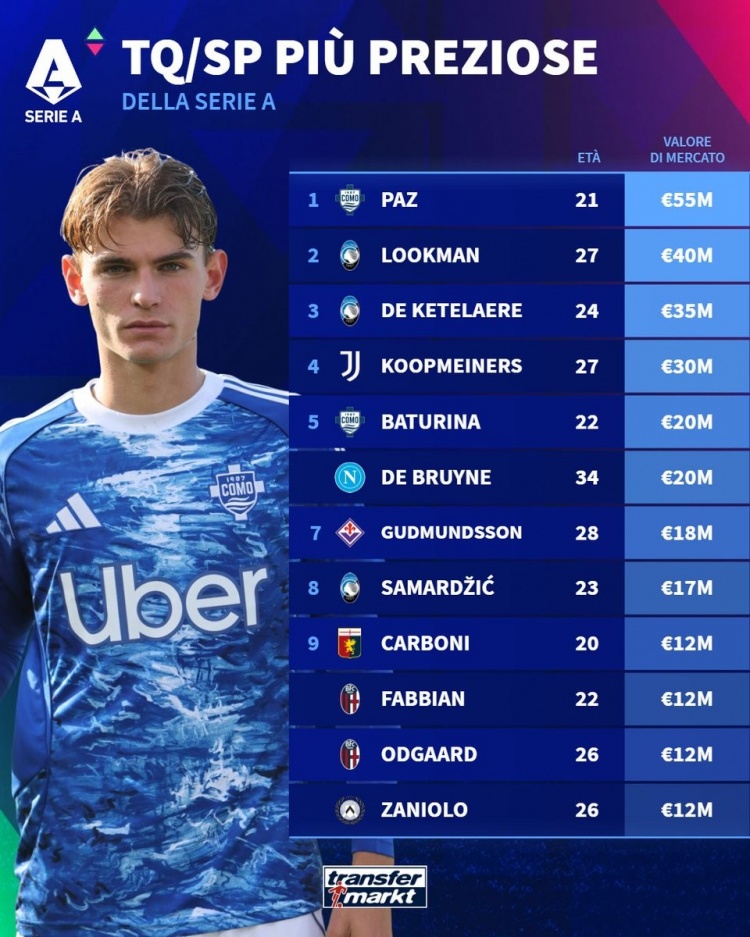 此外,还有古德蒙德森,他在佛罗伦萨的表现,身价为1800万欧;而年轻的萨马尔季奇和20岁的卡博尼,各自以1700万和1200万欧的身价则带来了更多活力。此外,法比安、奥德加德和扎尼奥洛同样跻身前十,分别与卡博尼齐持平,都以1200万欧的价格展现出他们在意甲的竞争力。