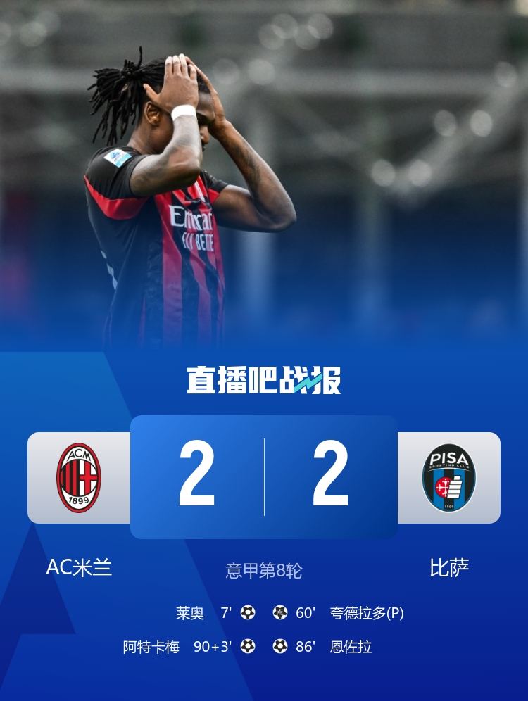 比赛最终以2-2结束,米兰在各项赛事中保持不败,继续以2分的优势领跑意甲。本场比赛对于双方来说均发挥了重要的作用,展现出高水平的竞技状态。