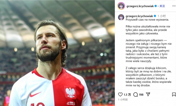 波兰中场克里乔维亚克于今日正式宣布退役,结束了他丰富多彩的职业生涯。现年35岁的他在社交媒体上发表了一封告别信,表达了对自己足球生涯的深刻感悟。