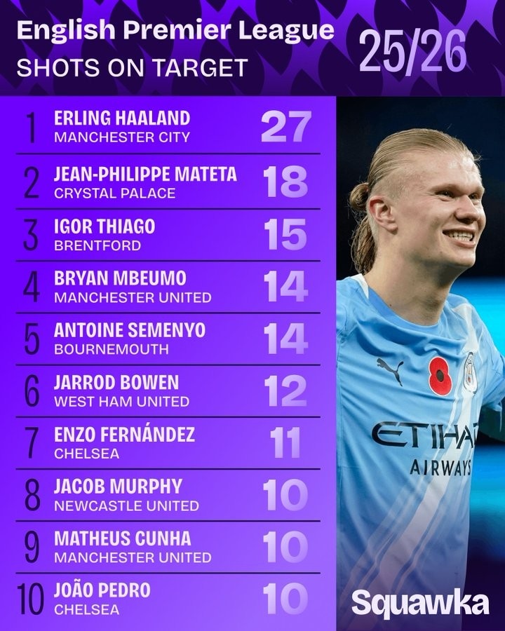 随着英超联赛的激烈角逐到第11轮,各大球队的表现愈加引人瞩目。根据squawka的数据,本赛季的射正次数排行榜上,曼城的超级前锋哈兰德表现异常抢眼,以27次的精准射门遥遥领先。