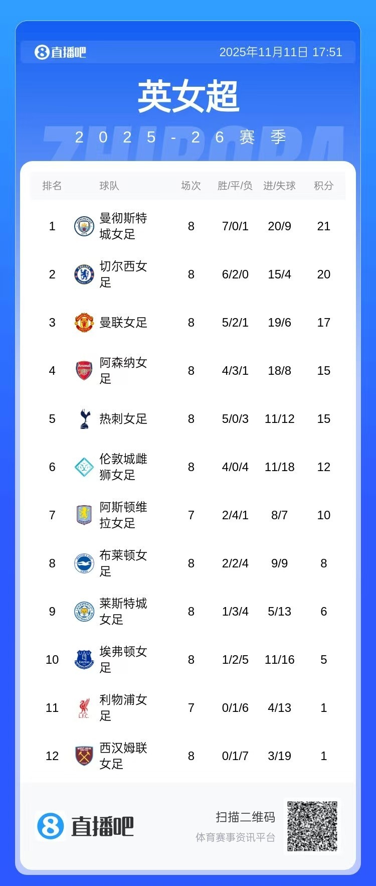 另外,利物浦女足目前排名第11,而阿斯顿维拉女足则位于第7名。两队目前少赛一场,期待她们在12月11日的补赛中展现出色的竞技状态。这场比赛无疑将为积分榜带来新的变化,也为球迷们提供了更多的期待。整个联赛的竞争依旧非常激烈,球队和球员们每一场比赛都拼尽全力,为争夺更高的排名而战。