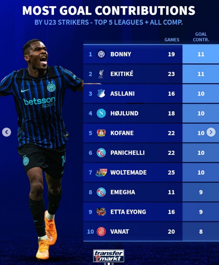 根据《转会市场》的统计数据,本赛季在五大联赛中表现突出的U23前锋们在各项赛事中的进球参与情况引人注目。其中,来自国际米兰的博尼和利物浦的埃基蒂克表现尤为抢眼,他们都以11个进球并列领先。两位年轻球员都在各自的比赛中发挥出了极高的效率,为球队贡献了许多关键的进球。