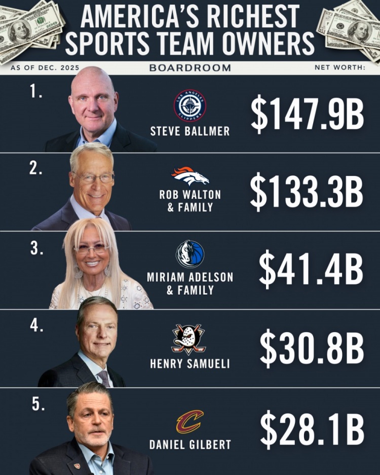 排名第四的是亨利·塞缪尔,作为冰球球队安纳海姆鸭队的老板,他在体育界同样享有盛誉。最后,排名第五的是克里夫兰骑士队的老板吉尔伯特,他在篮球领域有着显著的影响力。