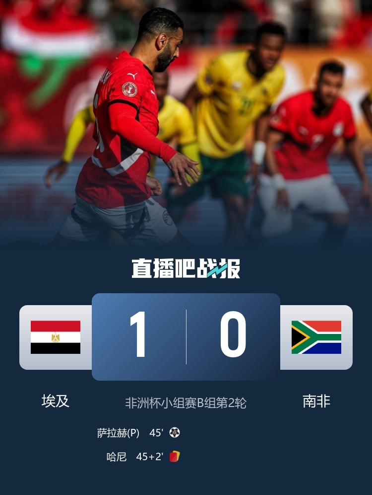 在12月27日晚上11点的非洲杯小组赛B组第2轮中,埃及迎战南非。在上半场的比赛中,埃及队的明星球员萨拉赫制造了点球并成功主罚进账,助球队取得领先。然而,随之而来的转折是穆罕默德·哈尼在补时阶段因犯规被红牌罚下,造成埃及只剩十人应战。尽管下半场双方都未能再改写比分,但埃及以1-0的结果战胜南非,取得小组赛连胜,提前锁定小组第一的位置。