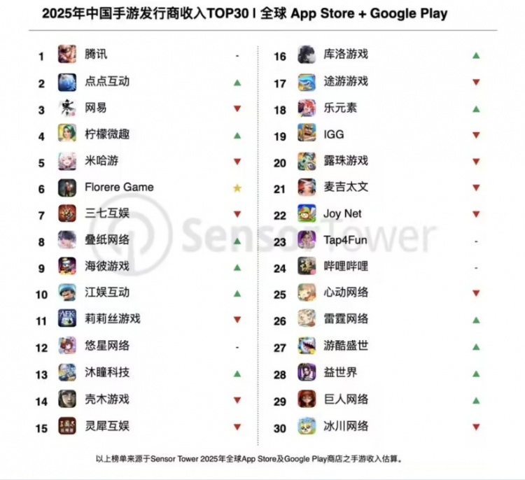 在2025年,中国前30大手游发行商预计将吸金233亿美元(约合1627.64亿元人民币),与2024年相比基本持平,占据全球前100大手游发行商收入的35%。腾讯凭借《王者荣耀》、《和平精英》和《PUBG MOBILE》等知名手游,继续在全球手游发行商收入榜上领跑。