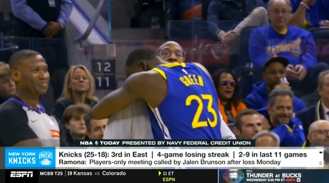 在最近的直播节目《NBA TODAY》中,ESPN记者Ramona Shelburne谈论了纽约尼克斯主教练迈克·布朗的一个引发争议的举动。她提到,众所周知,卡尔-安东尼·唐斯与德雷蒙德·格林之间的关系并不融洽,曾在播客上展开过几轮激烈辩论,紧张气氛甚是明显。然而,在一场比赛结束后,当追梦在场上绊倒唐斯并因此被判罚一级恶犯后,布朗却被看到与追梦亲密交谈,并相互拥抱。