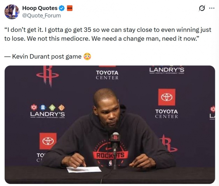 在1月24日的一场精彩比赛中,火箭队在加时赛中以122-128不敌76人,令球迷们倍感遗憾。赛后,杜兰特接受了媒体采访,表达了对球队表现的不满。他直言不讳地说道:“我无法理解这场比赛。为了能让比赛保持悬念,我必须拿下35分,结果却还是以失败告终。这样的表现是我们不该接受的,我们亟需改变,不能再继续这样下去了。哦不,我还有工作要做,无论胜负,我依然能够赚取丰厚的薪水。”