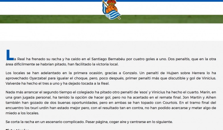 这场比赛让皇家社会本来的良好状态遭遇了考验,在伯纳乌球场的失利,尤其是这两个颇具争议的点球,打击了球队的士气。如果同样的犯规发生在另一支球队的禁区内,恐怕裁判的判罚会截然不同。