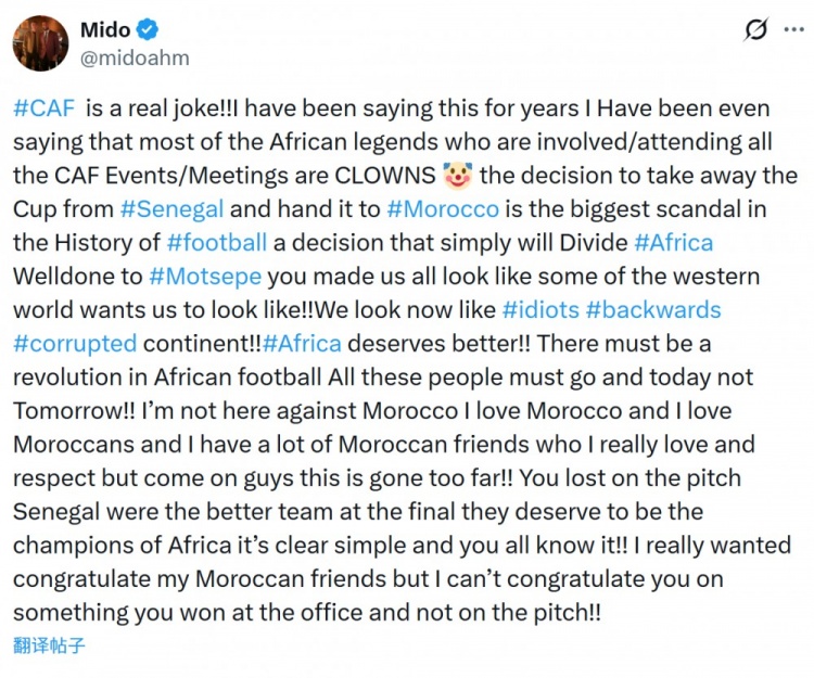 米多,一个曾经的埃及国脚,如今却成了社交媒体的喷子,最近针对非洲足联的行为大声疾呼。他的言辞犀利到让人想笑:顺便提一下,非洲足联还真是个令人捧腹的笑话!多年来,他心里一直踏实地觉得,那些出席非足联活动的“传奇人物”不过是一群戴着小丑面具的骗子。