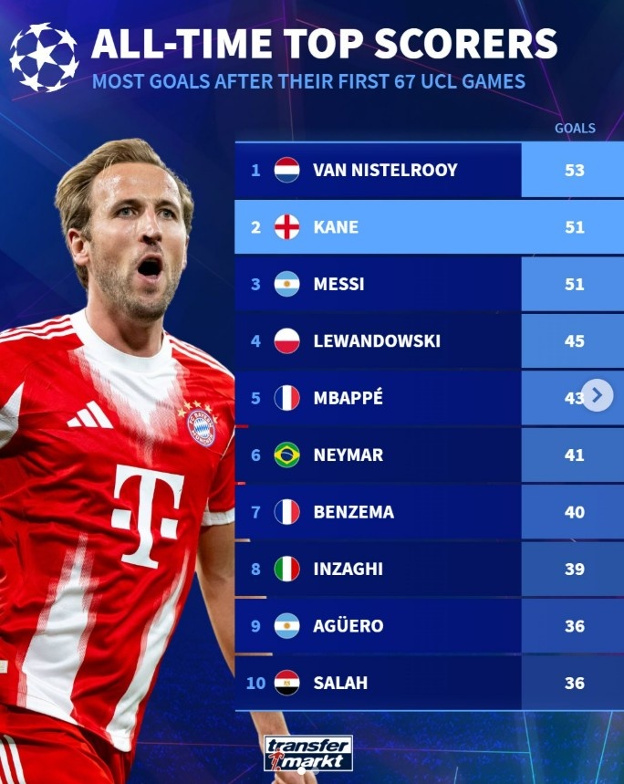 在刚刚结束的欧冠淘汰赛首回合中,拜仁慕尼黑以2-1击败皇家马德里,凯恩的进球成为了比赛的亮点。这一进球不仅帮助球队赢得了胜利,更让凯恩在个人的欧冠旅途中达成了里程碑——在67场欧冠比赛中攻入了第51球,成为进球榜上与梅西并肩而立的传奇人物,紧随范尼的脚步。