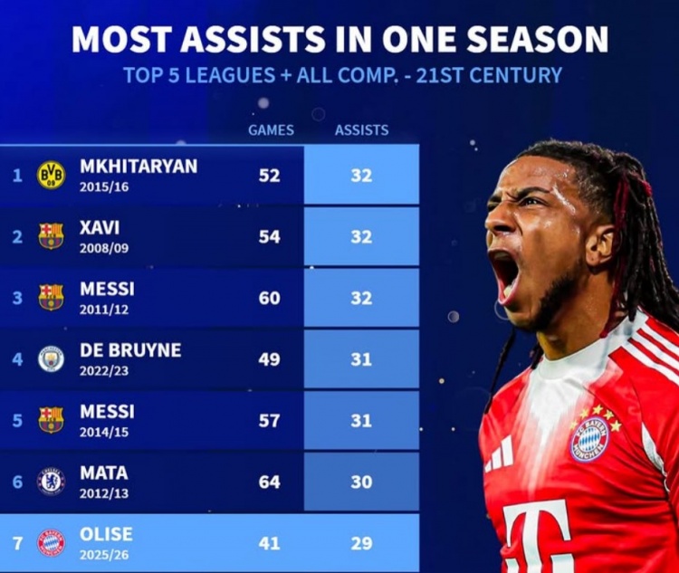 在4月11日的欧冠比赛中,拜仁慕尼黑客场以2-1战胜皇家马德里,奥利塞在比赛中奉献了一次助攻。《转会市场》数据显示,他的助攻数据使他跻身新世纪五大联赛单赛季各项赛事助攻的第七位。